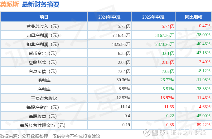 据证券之星公开数据整理,近期英派斯(002899)发布2025年中报。截至本报告期末,公司营业总收入5.74亿元,同比上升0.47%,归母净利润3167.36万元,同比下降38.09%。按单季度数据看,第二季度营业总收入2.84亿元,同比下降14.87%,第二季度归母净利润1748.45万元,同比下降53.1%。本报告期英派斯公司应收账款体量较大,当期应收账款占最新年报归母净利润比达195.33%。