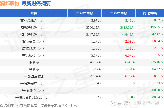 据证券之星公开数据整理,近期润都股份(002923)发布2025年中报。根据财报显示,润都股份净利润同比下降195.75%。截至本报告期末,公司营业总收入5.48亿元,同比下降8.22%,归母净利润-3619.31万元,同比下降195.75%。按单季度数据看,第二季度营业总收入2.93亿元,同比上升0.79%,第二季度归母净利润-3806.13万元,同比下降535.2%。