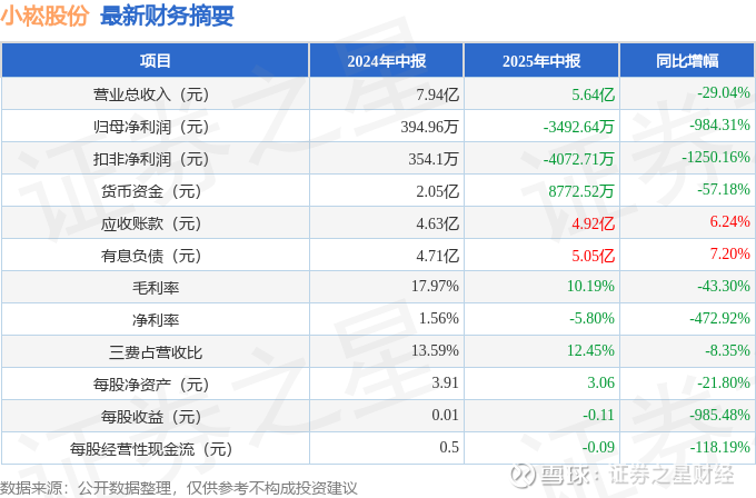 据证券之星公开数据整理,近期小崧股份(002723)发布2025年中报。根据财报显示,小崧股份净利润同比下降984.31%。截至本报告期末,公司营业总收入5.64亿元,同比下降29.04%,归母净利润-3492.64万元,同比下降984.31%。按单季度数据看,第二季度营业总收入2.33亿元,同比下降44.97%,第二季度归母净利润-2601.76万元,同比下降1413.55%。