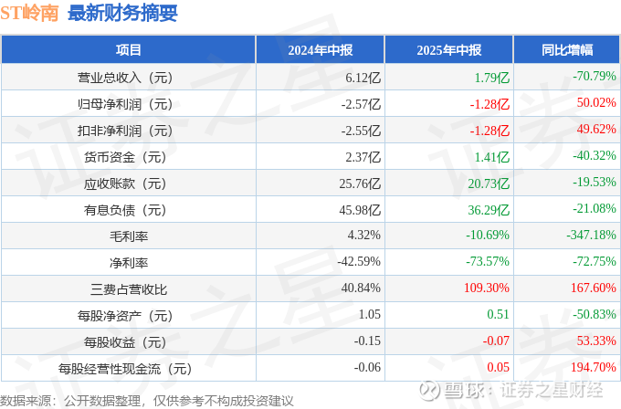 据证券之星公开数据整理,近期ST岭南(002717)发布2025年中报。截至本报告期末,公司营业总收入1.79亿元,同比下降70.79%,归母净利润-1.28亿元,同比上升50.02%。按单季度数据看,第二季度营业总收入1.11亿元,同比下降63.78%,第二季度归母净利润-6187.68万元,同比上升62.84%。本报告期ST岭南三费占比上升明显,财务费用、销售费用和管理费用总和占总营收同比增幅达166.09%。