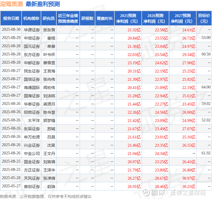 最新盈利预测明细如下: