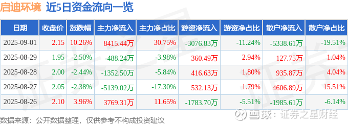 证券之星消息,启迪环境9月1日涨停收盘,收盘价2.15元。该股于10点23分涨停,未打开涨停,截止收盘封单资金为4378.93万元,占其流通市值1.43%。