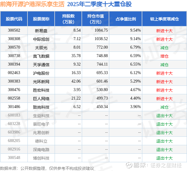 根据2025基金半年报公募基金重仓股数据,重仓该股的公募基金共2家,其中持有数量最多的公募基金为前海开源基金的前海开源沪港深乐享生活。前海开源沪港深乐享生活目前规模为1.14亿元,最新净值2.6206(8月29日),较上一交易日上涨1.51%,近一年上涨123.31%。该公募基金现任基金经理为魏淳 梁策。魏淳在任的基金产品包括:前海开源沪港深新硬件A,管理时间为2019年1月9日至今,期间收益率为125.6%;前海开源人工智能主题混合A,管理时间为2021年3月16日至今,期间收益率为-21.56%;前海开源沪港深强国产业混合,管理时间为2022年11月16日至今,期间收益率为32.01%。