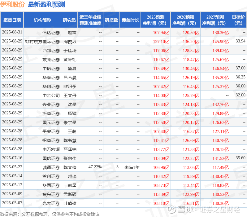 交银国际证券有限公司钱昊,肖凯希近期对伊利股份进行研究并发布了研究报告《2Q25业绩超预期,液体乳业务稳健发展;维持买入》,上调伊利股份目标价至34.5元,给予买入评级。