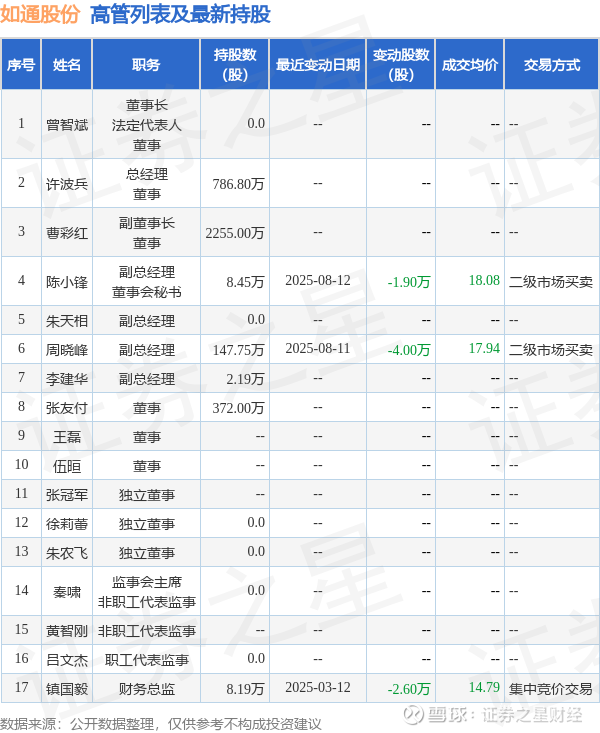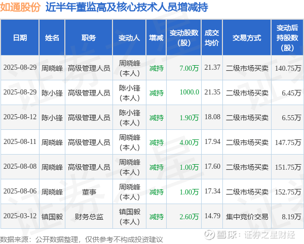 如通股份近半年内的董监高及核心技术人员增减持详情如下: