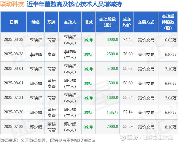 联动科技近半年内的董监高及核心技术人员增减持详情如下: