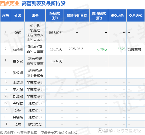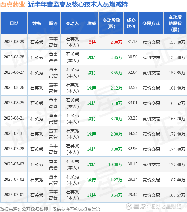 西点药业近半年内的董监高及核心技术人员增减持详情如下: