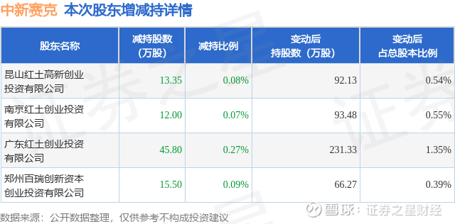 证券之星消息,9月1日中新赛克发布公告《中新赛克:关于股东减持计划时间届满的公告》,其股东昆山红土高新创业投资有限公司、南京红土创业投资有限公司、广东红土创业投资有限公司、郑州百瑞创新资本创业投资有限公司于2025年8月7日至2025年8月29日间合计减持86.65万股,占公司目前总股本的0.5075%,变动期间该股股价上涨5.88%,截止8月29日收盘报30.8元。