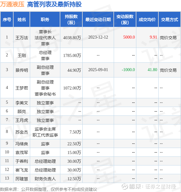 万通液压的高管列表及最新持股情况如下: