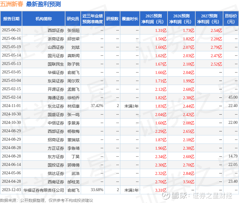 最新盈利预测明细如下: