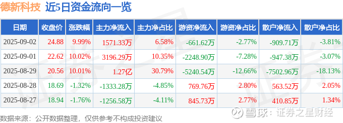 证券之星消息,德新科技9月2日涨停收盘,收盘价24.88元。该股于9点25分涨停,1次打开涨停,截止收盘封单资金为1.45亿元,占其流通市值2.51%。
