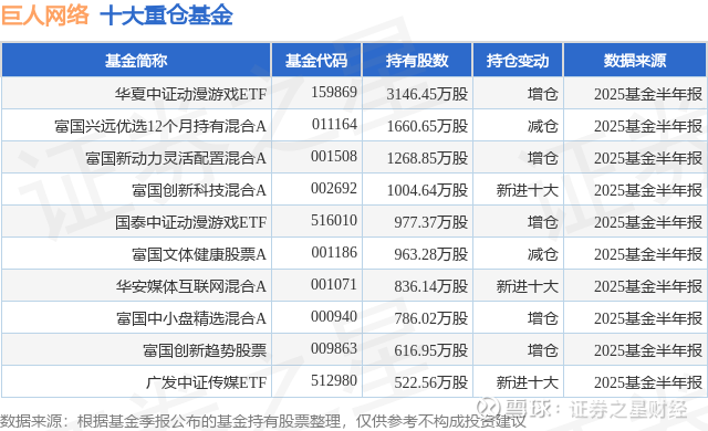 根据2025基金半年报公募基金重仓股数据,重仓该股的公募基金共102家,其中持有数量最多的公募基金为华夏基金的华夏中证动漫游戏ETF。华夏中证动漫游戏ETF目前规模为70.73亿元,最新净值1.4592(9月1日),较上一交易日下跌1.14%,近一年上涨88.75%。该公募基金现任基金经理为鲁亚运。鲁亚运在任的基金产品包括:华夏创业板成长ETF联接A,管理时间为2022年6月10日至今,期间收益率为-3.7%;华夏中证全指证券公司ETF联接A,管理时间为2022年6月10日至今,期间收益率为42.02%;华夏国证疫苗与生物科技指数发起A,管理时间为2022年9月6日至今,期间收益率为-26.72%;华夏战略新兴成指ETF联接A,管理时间为2023年3月27日至今,期间收益率为22.83%。