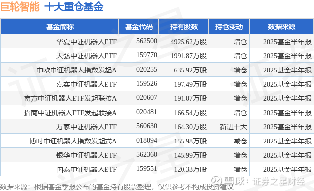 根据2025基金半年报公募基金重仓股数据,重仓该股的公募基金共14家,其中持有数量最多的公募基金为华夏基金的华夏中证机器人ETF。华夏中证机器人ETF目前规模为144.71亿元,最新净值1.0215(9月1日),较上一交易日下跌0.13%,近一年上涨79.3%。该公募基金现任基金经理为华龙。华龙在任的基金产品包括:华夏饲料豆粕期货ETF联接A,管理时间为2022年8月22日至今,期间收益率为15.56%;华夏上证50AH优选指数A,管理时间为2022年8月22日至今,期间收益率为26.17%;华夏中证机器人ETF发起式联接A,管理时间为2023年5月31日至今,期间收益率为23.73%;华夏消费电子ETF联接A,管理时间为2023年6月2日至今,期间收益率为53.75%。