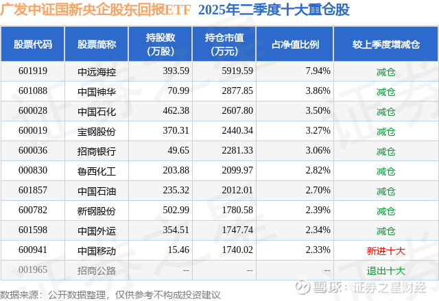 根据2025基金半年报公募基金重仓股数据,重仓该股的公募基金共8家,其中持有数量最多的公募基金为广发基金的广发中证国新央企股东回报ETF。广发中证国新央企股东回报ETF目前规模为7.45亿元,最新净值1.1568(9月1日),较上一交易日上涨0.48%,近一年上涨23.81%。该公募基金现任基金经理为罗国庆。罗国庆在任的基金产品包括:广发中证传媒ETF,管理时间为2017年12月27日至今,期间收益率为-0.05%;广发中证传媒ETF联接A,管理时间为2018年1月2日至今,期间收益率为0.78%;广发中证A100ETF联接A,管理时间为2019年5月27日至今,期间收益率为29.6%;广发中证创新药产业ETF,管理时间为2020年12月3日至今,期间收益率为-28.72%。