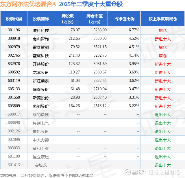 根据2025基金半年报公募基金重仓股数据,重仓该股的公募基金共17家,其中持有数量最多的公募基金为东方阿尔法基金的东方阿尔法优选混合A。东方阿尔法优选混合A目前规模为1.01亿元,最新净值1.0911(9月1日),较上一交易日上涨0.05%,近一年上涨87.31%。该公募基金现任基金经理为周谧。周谧在任的基金产品包括:东方阿尔法科技优选混合发起A,管理时间为2025年6月12日至今,期间收益率为3.37%;东方阿尔法产业先锋混合A,管理时间为2025年7月1日至今,期间收益率为24.84%。