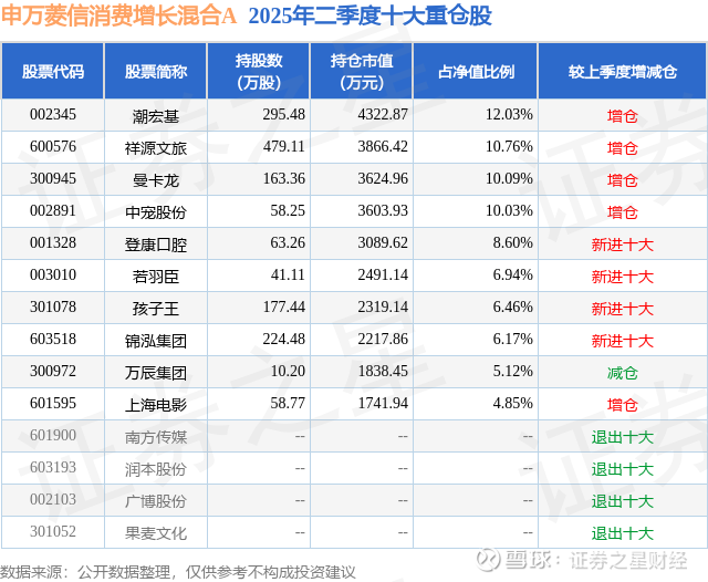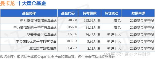 根据2025基金半年报公募基金重仓股数据,重仓该股的公募基金共5家,其中持有数量最多的公募基金为申万菱信基金的申万菱信消费增长混合A。申万菱信消费增长混合A目前规模为1.63亿元,最新净值1.575(9月1日),较上一交易日上涨1.68%,近一年上涨72.13%。该公募基金现任基金经理为刘含。刘含在任的基金产品包括:申万菱信乐融一年持有混合A,管理时间为2023年11月29日至今,期间收益率为68.45%。