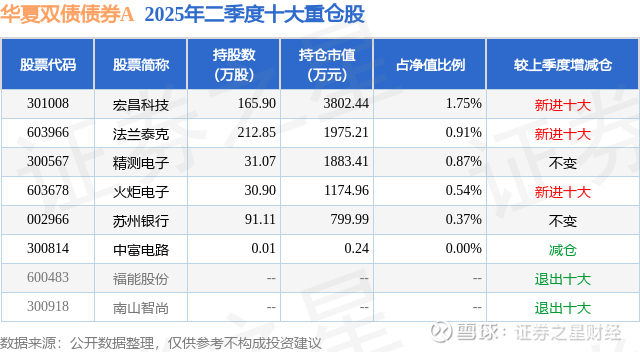 根据2025基金半年报公募基金重仓股数据,重仓该股的公募基金共1家,其中持有数量最多的公募基金为华夏基金的华夏双债债券A。华夏双债债券A目前规模为15.5亿元,最新净值2.0289(9月1日),较上一交易日下跌0.38%,近一年上涨26.38%。该公募基金现任基金经理为柳万军。柳万军在任的基金产品包括:华夏纯债债券A,管理时间为2017年9月8日至今,期间收益率为35.63%;华夏永康添福混合A,管理时间为2019年7月15日至今,期间收益率为77.45%;华夏鼎清债券A,管理时间为2020年12月3日至今,期间收益率为18.3%。