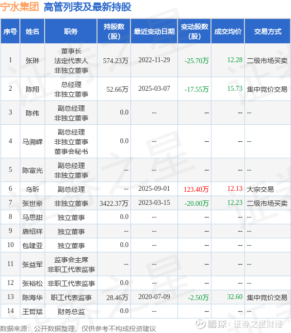 宁水集团近半年内的董监高及核心技术人员增减持详情如下: