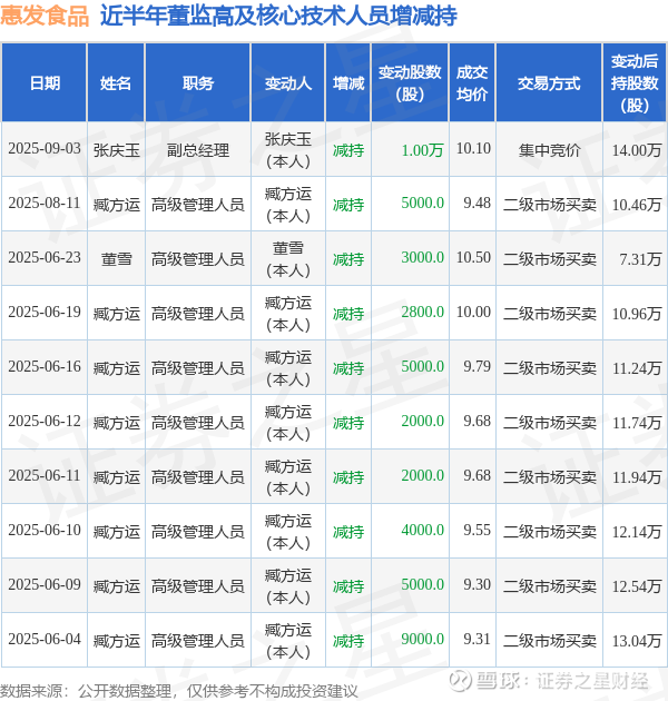 惠发食品近半年内的董监高及核心技术人员增减持详情如下: