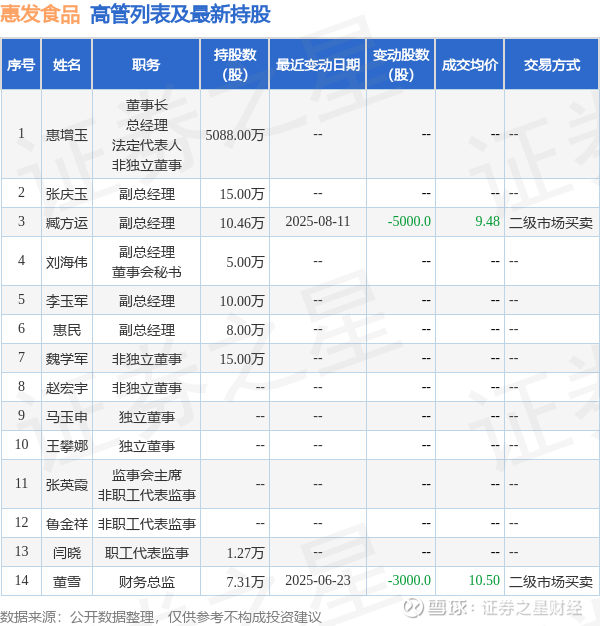 惠发食品的高管列表及最新持股情况如下: