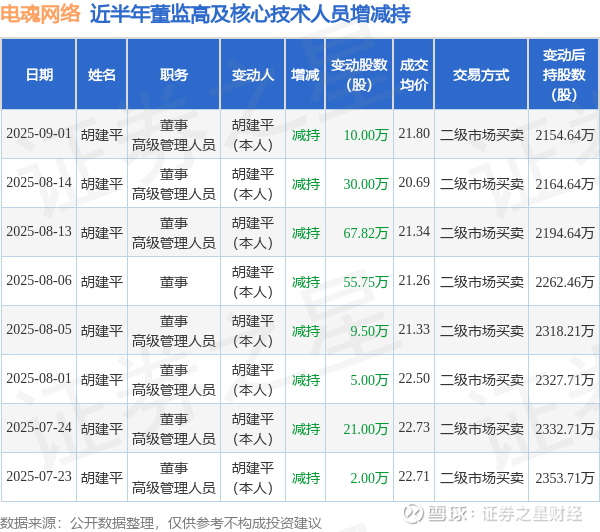 证券之星消息,根据9月2日市场公开信息、上市公司公告及交易所披露数据整理,电魂网络(603258)最新董监高及相关人员股份变动情况:2025年9月1日公司董事,高级管理人员胡建平共减持公司股份10.0万股,占公司总股本为0.041%。变动期间公司股价下跌2.72%,9月1日当日收盘报21.81元。