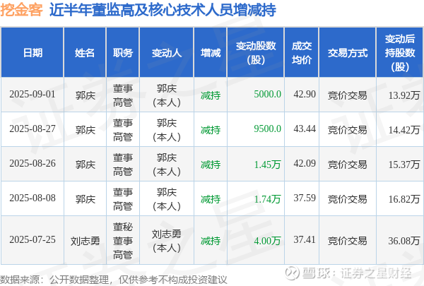 挖金客近半年内的董监高及核心技术人员增减持详情如下: