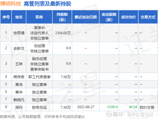 博硕科技近半年内的董监高及核心技术人员增减持详情如下: