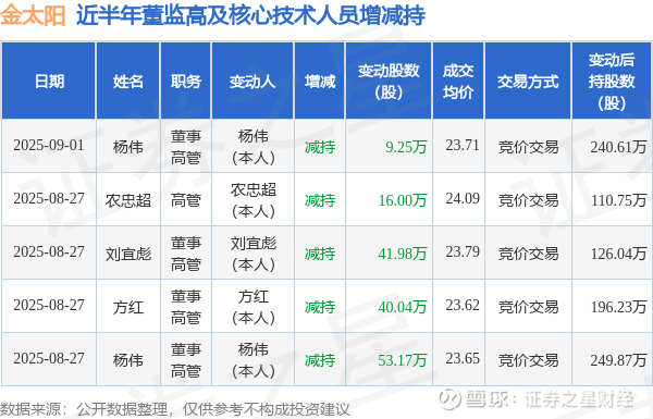 金太阳近半年内的董监高及核心技术人员增减持详情如下: