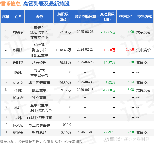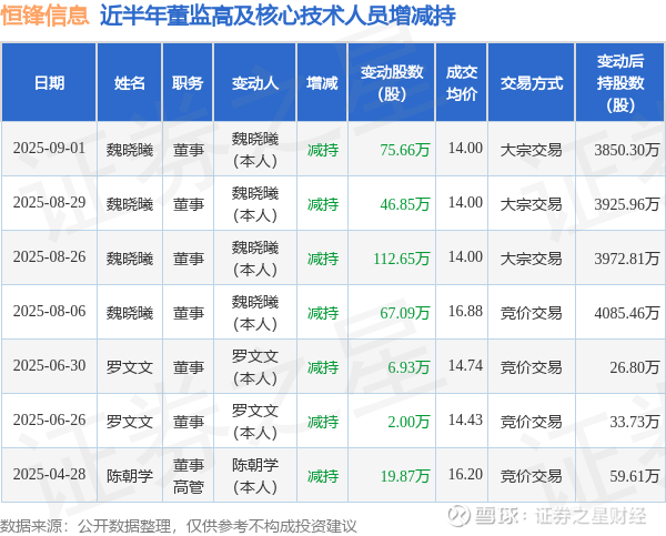 恒锋信息近半年内的董监高及核心技术人员增减持详情如下: