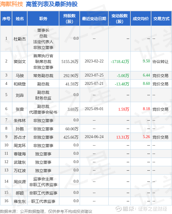 证券之星消息,根据9月2日市场公开信息、上市公司公告及交易所披露数据整理,海默科技(300084)最新董监高及相关人员股份变动情况:2025年9月1日公司董秘,高管张雷共增持公司股份1.59万股,占公司总股本为0.0031%。变动期间公司股价上涨0.24%,9月1日当日收盘报8.27元。