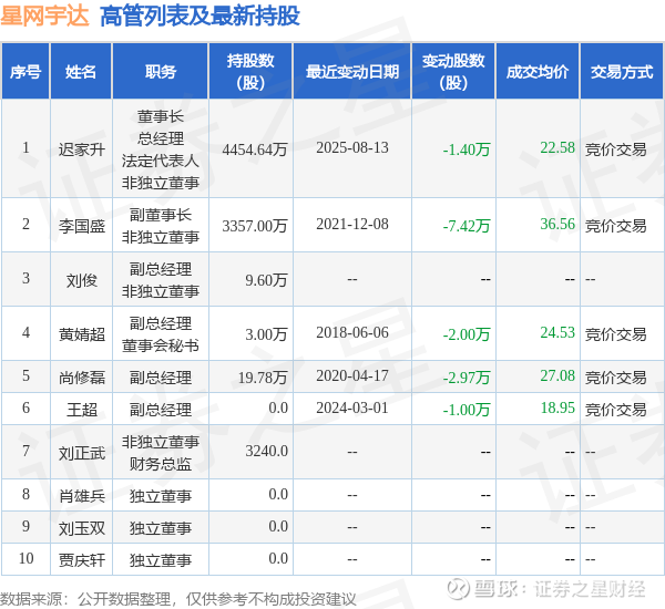 证券之星消息,根据9月2日市场公开信息、上市公司公告及交易所披露数据整理,星网宇达(002829)最新董监高及相关人员股份变动情况:2025年9月1日公司董事,高管迟家升共减持公司股份104.01万股,占公司总股本为0.5005%。变动期间公司股价下跌1.5%,9月1日当日收盘报23.68元。