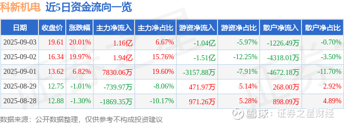 证券之星消息,科新机电9月3日涨停收盘,收盘价19.61元。该股于13点10分涨停,3次打开涨停,截止收盘封单资金为2670.58万元,占其流通市值0.65%。