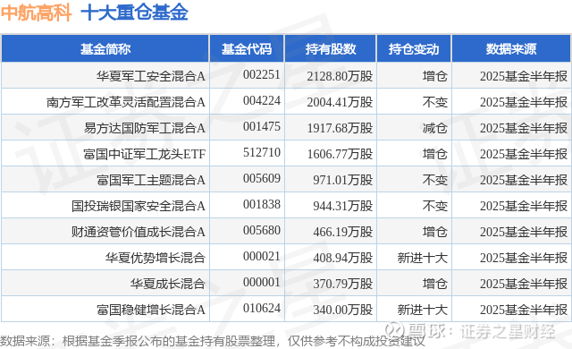 根据2025基金半年报公募基金重仓股数据,重仓该股的公募基金共69家,其中持有数量最多的公募基金为华夏基金的华夏军工安全混合A。华夏军工安全混合A目前规模为44.86亿元,最新净值1.798(9月2日),较上一交易日下跌3.49%,近一年上涨59.96%。该公募基金现任基金经理为万方方。