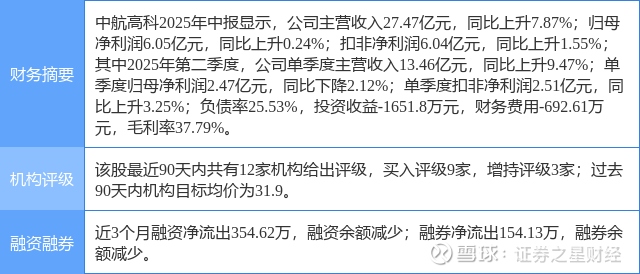2025年9月1日,太平洋研究员马浩然发布了对中航高科的研报《核心主业保持增长,产能布局持续优化》,该研报对中航高科给出“买入”评级,认为其目标价为30.0元,研报发布时股价为25.55元,预期涨幅为17.42%。研报中预计公司2025-2027年的净利润为11.72亿元、13.59亿元、15.62亿元,EPS为0.84元、0.98元、1.12元,对应PE为30倍、26倍、23倍,维持“买入”评级。证券之星数据中心根据近三年发布的研报数据计算,该研报作者对此股的盈利预测准确度为75.34%。