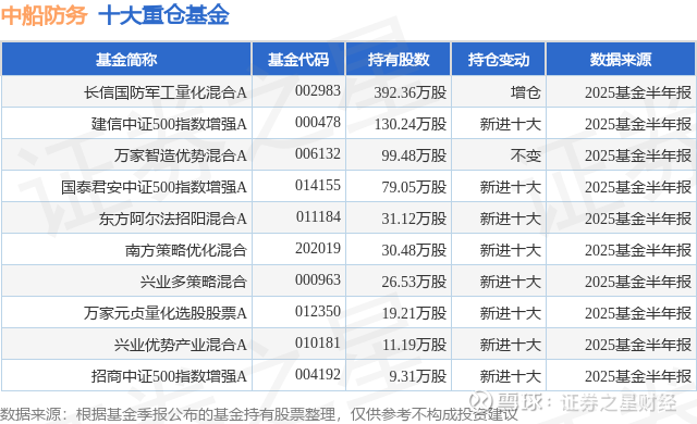 根据2025基金半年报公募基金重仓股数据,重仓该股的公募基金共16家,其中持有数量最多的公募基金为长信基金的长信国防军工量化混合A。长信国防军工量化混合A目前规模为7.57亿元,最新净值1.7284(9月2日),较上一交易日下跌3.41%,近一年上涨76.78%。该公募基金现任基金经理为宋海岸。宋海岸在任的基金产品包括:长信中证500指数增强A,管理时间为2018年2月12日至今,期间收益率为101.74%;长信沪深300指数增强A,管理时间为2019年5月16日至今,期间收益率为78.64%;长信先进装备三个月持有混合A,管理时间为2021年11月29日至今,期间收益率为-8.56%。