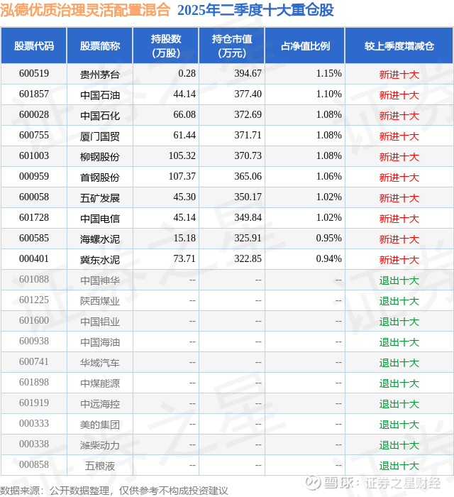 泓德优质治理灵活配置混合的前十大重仓股如下: