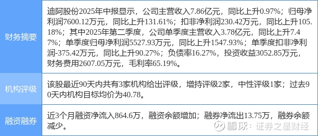 2025年9月2日,开源证券研究员黄泽鹏,姚慕宇发布了对迪阿股份的研报《公司信息更新报告:2025H1经营端企稳恢复,渠道优化初见成效》,该研报对迪阿股份给出“买入”评级。研报中预计2025-2027年归母净利润为1.30/2.03/2.86亿元(2025-2026原值为2.68/4.00亿元),对应EPS为0.33/0.51/0.71元,当前股价对应PE为109.9/70.6/50.1倍,维持“买入”评级。证券之星数据中心根据近三年发布的研报数据计算,该研报作者对此股的盈利预测准确度为15.86%。