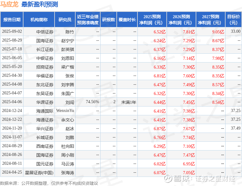 最新盈利预测明细如下: