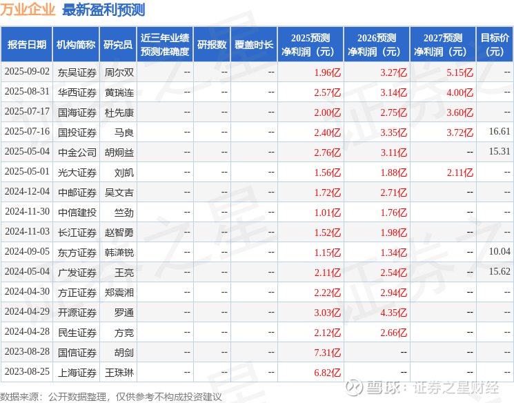最新盈利预测明细如下: