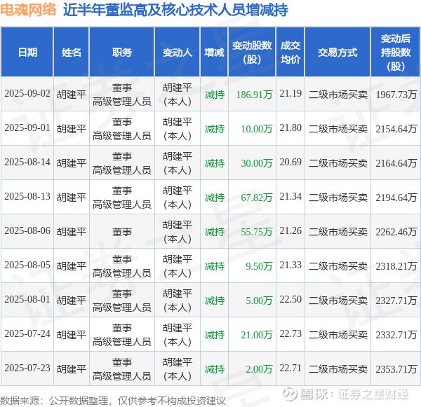 证券之星消息,根据9月3日市场公开信息、上市公司公告及交易所披露数据整理,电魂网络(603258)最新董监高及相关人员股份变动情况:2025年9月2日公司董事,高级管理人员胡建平共减持公司股份186.91万股,占公司总股本为0.766%。变动期间公司股价下跌3.62%,9月2日当日收盘报21.02元。