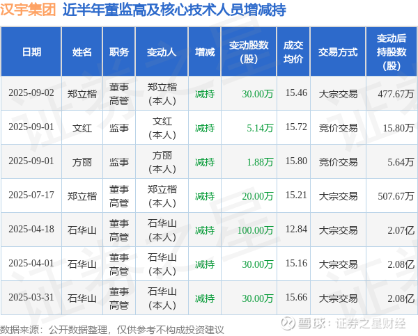 汉宇集团近半年内的董监高及核心技术人员增减持详情如下: