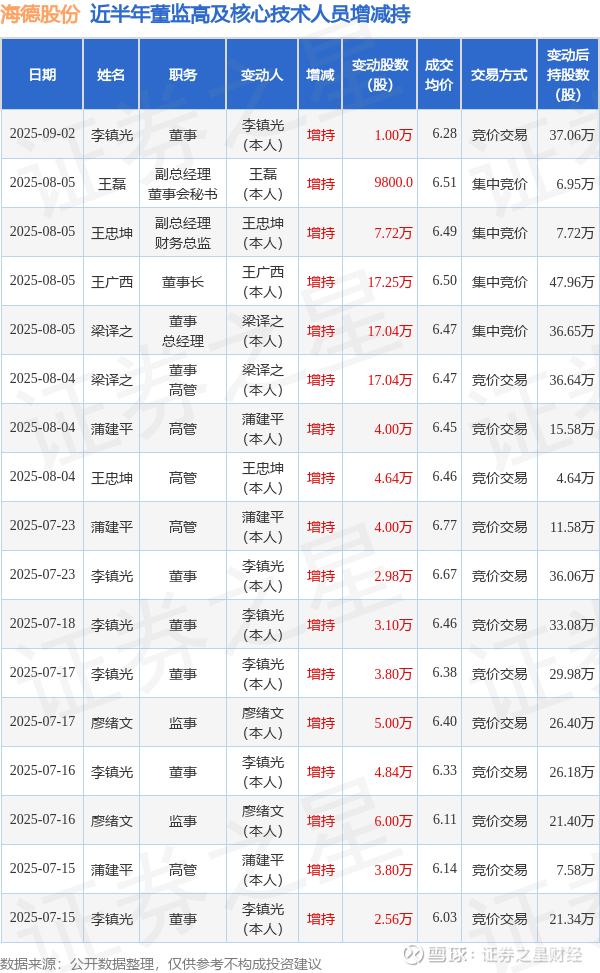 海德股份近半年内的董监高及核心技术人员增减持详情如下: