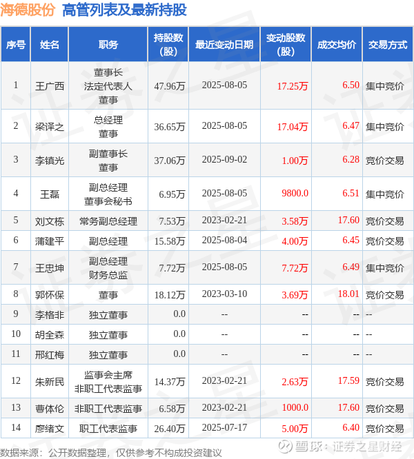 海德股份的高管列表及最新持股情况如下: