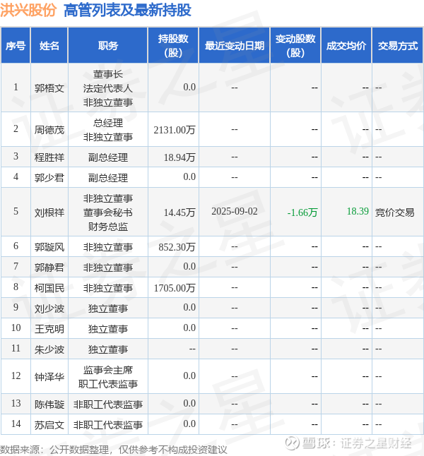 洪兴股份的高管列表及最新持股情况如下: