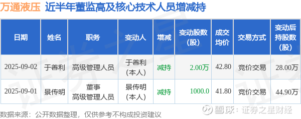 万通液压近半年内的董监高及核心技术人员增减持详情如下: