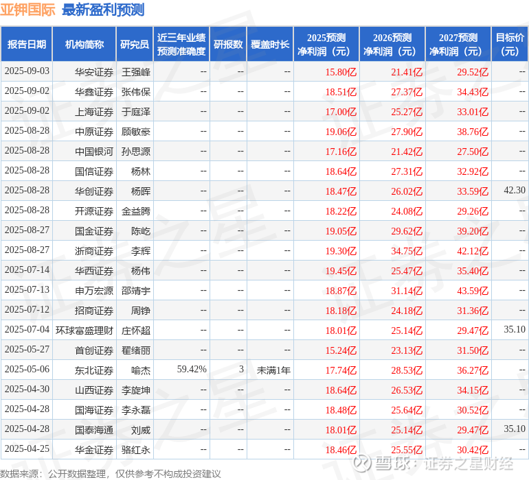 亚钾国际(000893) 事件描述 8月28日,公司发布《2025半年度报告》,2025H1,实现营业收入25.2亿元,同比+48.5%;归母净利润8.5亿元,同比+216.6%;扣非归母净利润8.6亿元,同比+219.5%。2025Q2实现营业总收入13.1亿元,同环比分别+23.0%/+8.0%;归母净利润4.7亿元,同环比分别+149.2%/+22.4%;扣非后归母净利润4.7亿元,同环比分别+152.1%/+23.0%。 事件点评 钾肥量价双升驱动业绩高增。2025H1,公司生产氯化钾产品101.41万吨,同比增长20.0%;销售氯化钾销售104.54万吨,同比增长21.4%,氯化钾营业收入为24.6亿元,同比+48.3%,氯化钾毛利率为58.2%,同比+10.3pct。 据百川盈孚数据统计,2025H1氯化钾市场均价2944元/吨,同比增长20.6%,2025年7月1日-8月27日氯化钾市场均价3276元/吨,较上半年增长11.3%。 老挝钾盐矿资源丰富,产能扩建加速推进。公司已在老挝甘蒙省获得263.3平方公里钾盐矿权,折纯氯化钾资源储量约10亿吨,具备良好的资源基础。目前公司拥有300万吨/年氯化钾选厂产能装置,第二、第三期各100万吨/年钾肥项目矿建工程已进入后期,3#主斜井正在推进,皮带运输系统即将安装,产能扩张计划持续加快,有助于巩固其在全球钾肥行业的地位。 积极拓展非钾产业链,提升资源综合利用价值。公司通过参股亚洲溴业,拥有2.5万吨/年溴素产能,并计划扩建至5万吨/年,推动非钾产业链多元化发展。未来公司将以钾为核心,延伸发展溴化工、盐化工、煤化工、复合肥项目以及高新产业一体化等产业链布局,不仅有效提升资源综合利用水平,也将为企业创造更多的经济效益,进一步增强公司的核心竞争力。 投资建议 预计公司2025-2027年归母净利分别为18.9/25.4/35.2亿元,对应 PE分别为16/12/9倍。考虑公司具备钾资源优势,国际化布局与产能扩张并重,未来业绩增长可期,维持“买入-B”评级。 风险提示 氯化钾价格波动、产能扩建不及预期、汇率波动等风险。