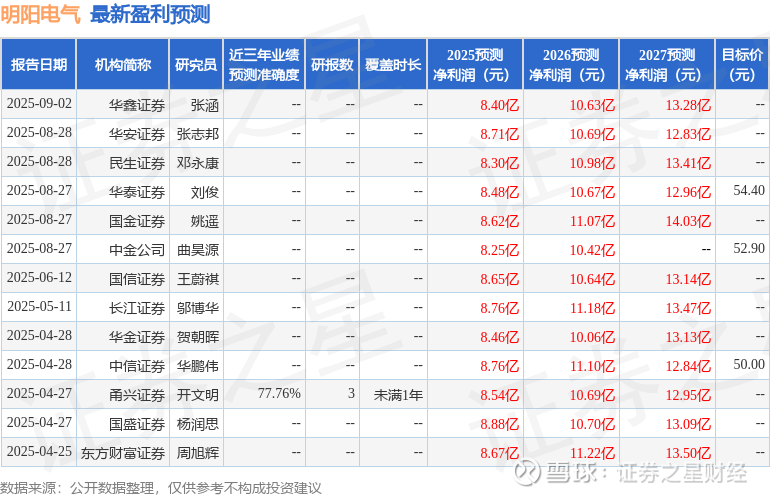 最新盈利预测明细如下: