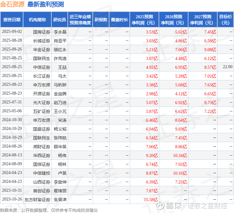 最新盈利预测明细如下: