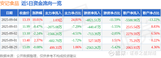 证券之星消息,安记食品9月4日涨停收盘,收盘价13.19元。该股于9点56分涨停,4次打开涨停,截止收盘封单资金为1729.12万元,占其流通市值0.56%。