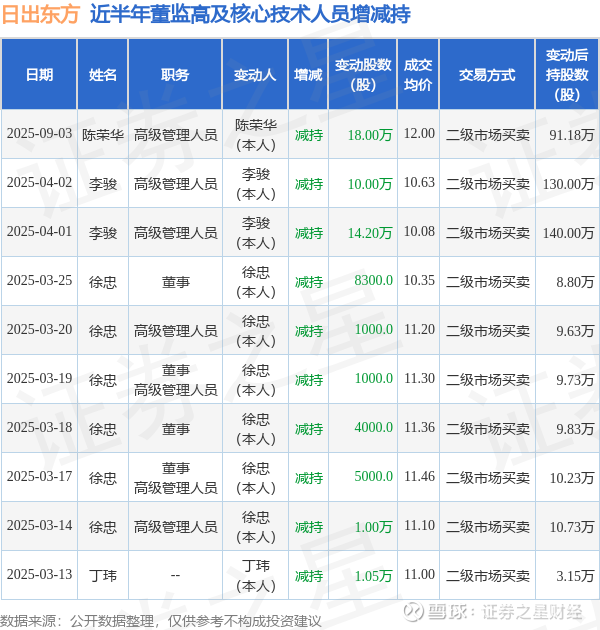 日出东方近半年内的董监高及核心技术人员增减持详情如下:
